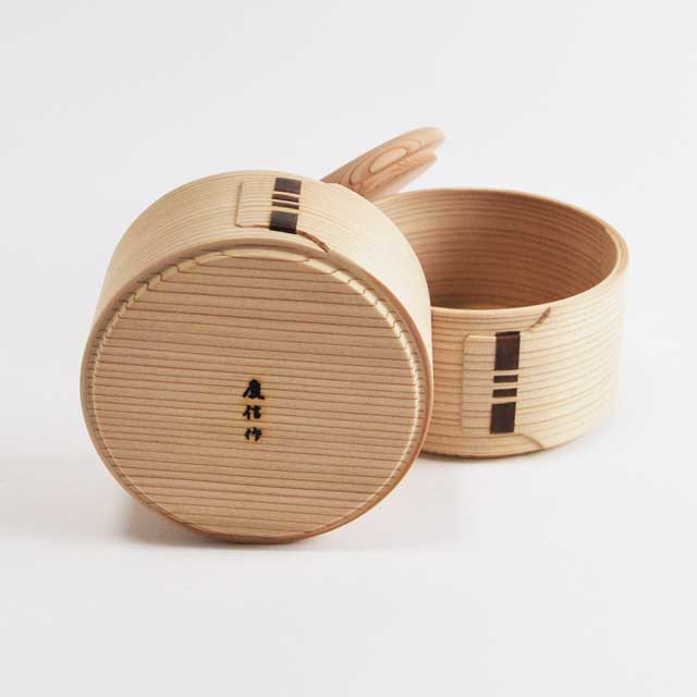 手のひらにすっぽり収まる丸い形を二段重ねたかわいらしい曲げわっぱです。